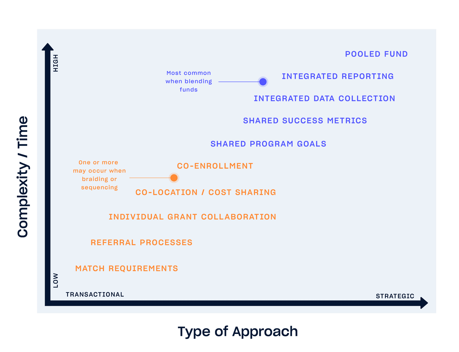 Each of these three funding models - blending, braiding, and sequencing - can be used to maximize the impact of a program. The level of effort can vary greatly depending on the existing depth of relationships and flexibility of infrastructure.